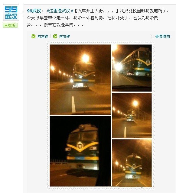 姚笛告訴記者,他家住漢口,在江夏某產(chǎn)業(yè)園一印務(wù)公司工作,昨日凌晨由于失眠,干脆早起上班。4時許,姚笛開車行駛在三環(huán)上,由武漢火車站往光谷方向,突然看到一個火車頭“迎面而來”(右圖),“我立刻踩剎車,近距離用手機(jī)拍下這一幕”。這條微博在網(wǎng)上被迅速轉(zhuǎn)發(fā),截止昨日發(fā)稿,共被轉(zhuǎn)發(fā)1056次,評論190條。