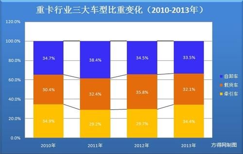 隨著牽引銷量增長帶來的比重擴大,重卡行業(yè)的比重結(jié)構(gòu)也發(fā)生一定變化。在2013年,牽引車在重卡市場的比重增長了4.7%,從2012年的29.7%增加到34.4%,使其市場份額從最末位上移至首位,一改2011年、2012年連續(xù)兩年占比最小的弱勢。而自卸車市場份額下降1%(從34.5%到33.5%),載貨車市場份額則下降了3.7%(從35.8%到32.2%)。這從側(cè)面也說明甩掛運輸?shù)玫竭M一步推廣,牽引車取代了部分載貨車市場需求。