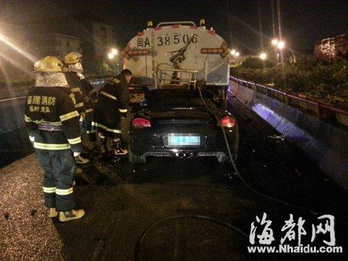 昨日凌晨1點半左右,福州二環(huán)路黎明高架橋上,一輛灑水車正在沖洗路面,后方一輛保時捷跑車突然撞上來,車頭鉆進灑水車底。灑水車是最常見的一種環(huán)衛(wèi)車,在路上常常可以看到灑水車綠化灑水。一般來說灑水車灑水的時候會打開音樂喇叭,打開警示燈等,在路肩位置緩慢行進灑水。來往車輛應該注意避讓。
