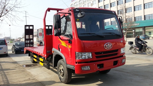 平板運輸車是專門用來拉挖掘機鉤機叉車等大型機械設備和工程機械的專用汽車。區(qū)別于一般的貨車載貨載重分布均勻的特點,拿平板運輸車最常見的用途拉挖掘機來說,挖掘機上下時必須要爬梯才能方便上下。挖掘機上下的時候?qū)ε捞莺驼嚨臎_擊非常大,所以必須要求爬梯的強度非常強才能經(jīng)久耐用。爬梯一般是用手動舉起和放下,所以平板運輸車廠家湖北俊龍專用汽車有限公司的平板運輸車產(chǎn)品都在爬梯上裝上兩根彈簧,而且對彈簧、彈簧支架的尺寸和位置通過精確計算設計制作,一個人就可以很方便的舉起和落下。平面承重部分因為挖掘機??康奈恢檬侵饕撝貐^(qū),我們在承重區(qū)加強方筒鋼鋪放密度,確保經(jīng)久耐用。目前是平板運輸車銷售的旺季,也正時值柴油車尾氣排放國三和國四切換的時候,很多平板運輸車用戶苦于沒有合適的國四平板運輸車產(chǎn)品,下面平板運輸車廠家湖北俊龍專用汽車有限公司為您推薦一款一汽解放出品底盤的平板運輸車產(chǎn)品,具體參數(shù)如下: