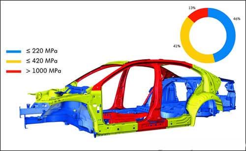 現(xiàn)代汽車的車身都是由不同強度的鋼板拼焊在一起的,不同強度等級的鋼板用于受力環(huán)境不同的位置,一些受力條件比較苛刻,又不能使用粗厚鋼板的位置則使用強度最高的鋼材,正所謂“好鋼用在刀刃上”。
