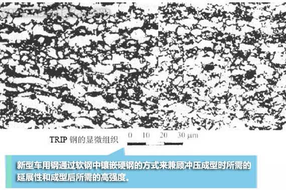 為了根本上解決高強度鋼的沖壓問題,一種新型鋼材正在被應用于汽車車身的生產(chǎn)。這種鋼材的基質(zhì)是比較柔軟韌性好的鐵素體,其中鑲嵌了硬度好的馬氏體。在沖壓時比較容易成型,成型后的材料又具有相當?shù)膹姸取?/SPAN>