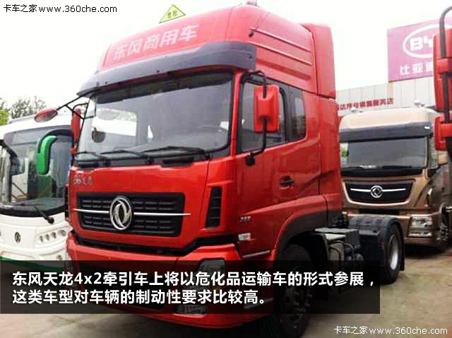 另外東風(fēng)天龍4x2牽引車上安裝有危險(xiǎn)標(biāo)識(shí),可見其將以?;愤\(yùn)輸車的形式參展,這類車型對(duì)車輛的制動(dòng)性要求比較高。