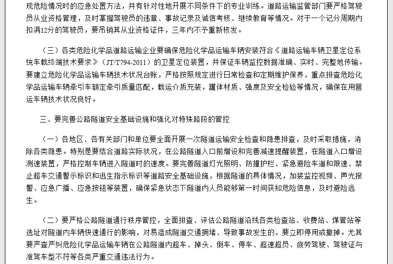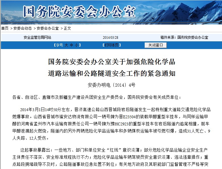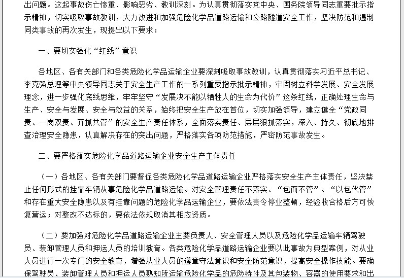 這起事故暴露出:一些地方、部門和單位安全“紅線”意識淡薄;部分危險化學(xué)品運輸企業(yè)安全生產(chǎn)主體責(zé)任不落實、安全標(biāo)準(zhǔn)規(guī)程執(zhí)行不力;危險化學(xué)品運輸車輛駕駛員安全意識淡薄、違法違章操作;重點路段擁堵疏導(dǎo)不及時,公路隧道事故應(yīng)急處置不到位;有關(guān)地方政府及其職能部門監(jiān)督管理不嚴(yán)格等突出問題。這起事故傷亡慘重、影響惡劣、教訓(xùn)深刻。為認(rèn)真貫徹落實黨中央、國務(wù)院領(lǐng)導(dǎo)同志重要批示指示精神,切實吸取事故教訓(xùn),大力改進(jìn)和加強(qiáng)危險化學(xué)品道路運輸和公路隧道安全工作,堅決防范和遏制同類事故的再次發(fā)生,現(xiàn)提出以下要求: