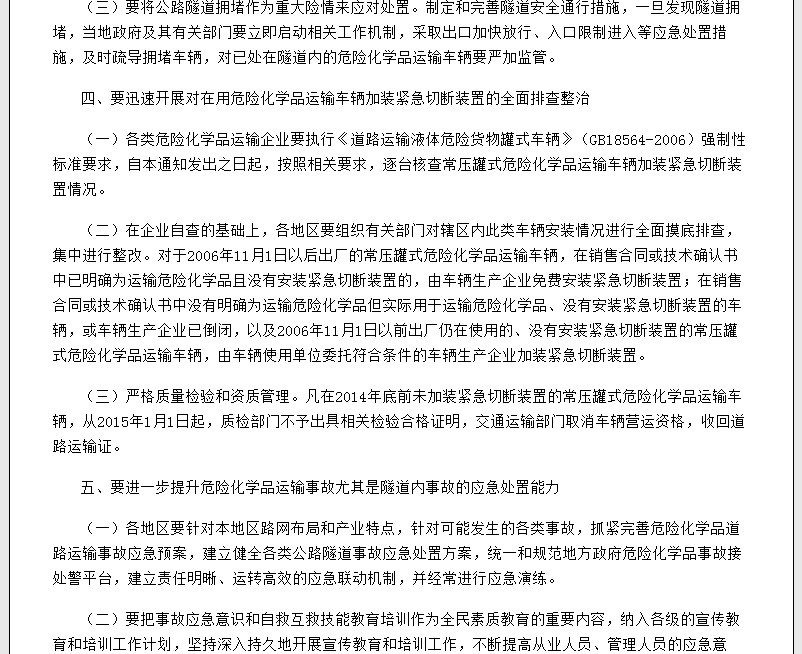 (一)各類危險化學(xué)品運輸企業(yè)要執(zhí)行《道路運輸液體危險貨物罐式車輛》(GB18564-2006)強(qiáng)制性標(biāo)準(zhǔn)要求,自本通知發(fā)出之日起,按照相關(guān)要求,逐臺核查常壓罐式危險化學(xué)品運輸車輛加裝緊急切斷裝置情況。