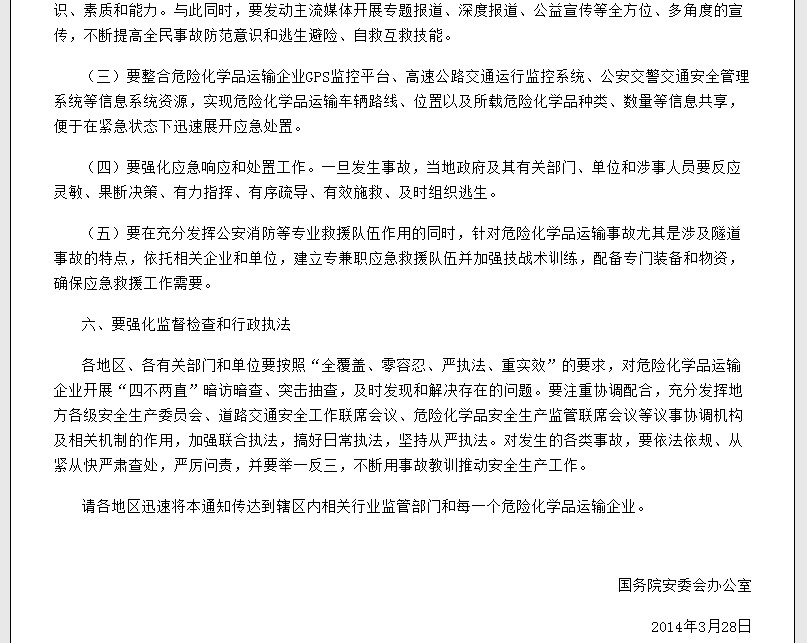 請各地區(qū)迅速將本通知傳達(dá)到轄區(qū)內(nèi)相關(guān)行業(yè)監(jiān)管部門和每一個危險化學(xué)品運輸企業(yè)。