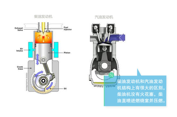柴油發(fā)動(dòng)機(jī)和汽油發(fā)動(dòng)機(jī)結(jié)構(gòu)上有很大的區(qū)別,柴油機(jī)沒(méi)有火花塞,它吸入并壓縮空氣,然后將燃油直接噴入燃燒腔(直噴式)。其實(shí)是壓縮空氣產(chǎn)生的熱量點(diǎn)燃了柴油機(jī)的燃油。