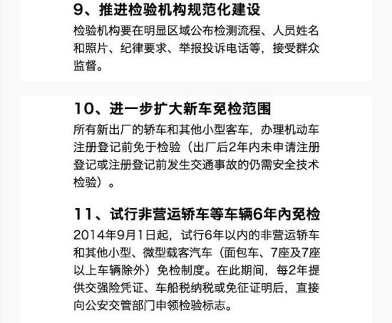 此次發(fā)布的免檢新規(guī)只適用于非營運(yùn)轎車而其它小型、微型載客汽車(面包車、7座及7座以上車輛除外)。也就是說7座及7座以上的SUVMPV車輛不在免檢車型之列。