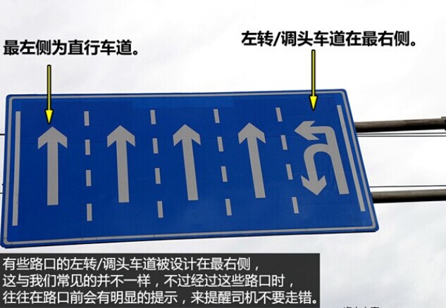 大多數(shù)左轉(zhuǎn)/調(diào)頭的車道都會在最左側(cè)車道,而有少數(shù)左轉(zhuǎn)/調(diào)頭車道會被安排在最右側(cè)車道,這可能是為了避免左轉(zhuǎn)/調(diào)頭車輛與直行車輛發(fā)生事故,或該路段較窄,調(diào)頭車輛不能順暢的通過而這樣設(shè)計的。