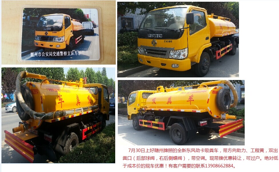 此車采用東風勁卡3300mm軸距吸糞車底盤,搭配朝柴95馬力發(fā)動機,國三手續(xù),罐體容積4.6立方左右,方向助力,帶空調(diào),全車工程黃,雙出糞口:罐尾100mm球閥,罐右后側(cè)200mm蝶閥。此車已上好隨州牌照,提車即可使用。全套手續(xù)、工具、資料齊全。此車為其他客戶已購的車輛,因為容積不能滿足該客戶使用要求,該客戶愿大幅降價換購更大車型,委托吸糞車廠家代賣。目前綜合看來非常有優(yōu)勢,有需要的請隨時致電!