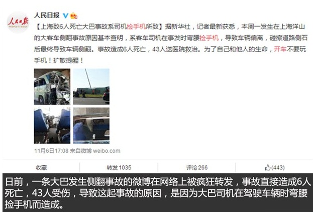相信大家都遇到過這種情況:開車時手機(jī)突然響了,當(dāng)司機(jī)拿起來時,手機(jī)卻掉在了地上。可能有些人會選擇邊開車邊去撿手機(jī),但這樣的做法是非常危險的,因為由于身體的傾斜,會帶動握在方向盤上的手,這樣方向盤就會隨著轉(zhuǎn)動,車輛就會改變前進(jìn)方向,這樣就很容易造成事故,文章開始時提到的大客車側(cè)翻,就是因為司機(jī)為了撿手機(jī)而造成了事故。