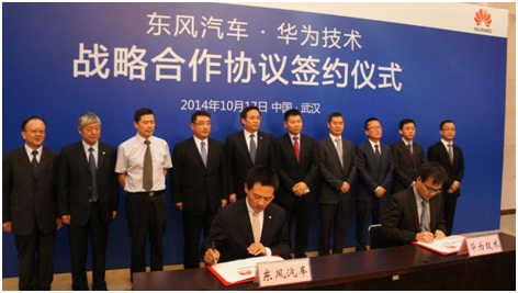 20141017日,東風(fēng)汽車公司與華為技術(shù)有限公司在武漢簽署戰(zhàn)略合作協(xié)議,雙方將在汽車電子、智能汽車、IT/ICT信息化建設(shè)等領(lǐng)域,協(xié)同創(chuàng)新,展開跨界合作。這是東風(fēng)主動(dòng)把握移動(dòng)互聯(lián)網(wǎng)的新機(jī)遇,積極開展模式創(chuàng)新的重大戰(zhàn)略安排,也是華為拓寬業(yè)務(wù)領(lǐng)域的關(guān)鍵舉措。