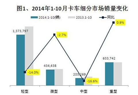 據(jù)整理的數(shù)據(jù),2014年1-10月,我國卡車市場(包括完整、非完整車輛以及半掛牽引車,下同)銷量同比下跌,銷量累計實現(xiàn)264.52萬輛,同比下滑9.3%。這主要與國四排放標準在國內推進,以及房地產投資增速持續(xù)回落等因素有關。