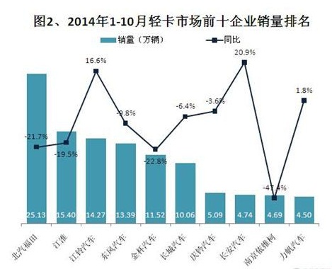 2014年1-10月,輕卡市場前十企業(yè)依次是北汽福田、江淮、江鈴汽車、東風汽車、金杯汽車、長城汽車、慶鈴汽車、長安汽車、南京依維柯和力帆汽車。