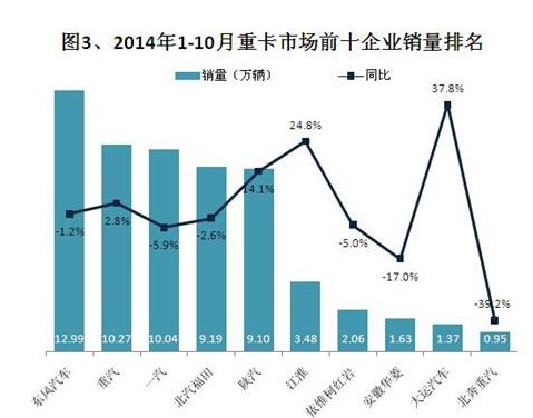 2014年1-10月,輕卡市場前十企業(yè)依次是東風汽車、重汽、一汽、北汽福田、陜汽、江淮、依維柯紅巖、安徽華菱、大運汽車和北奔重汽。