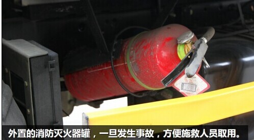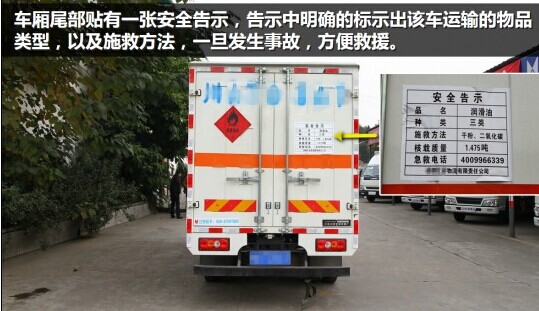 車廂尾部門板位置還貼有一張安全告示,告示中明確的標(biāo)示出該車運(yùn)輸?shù)奈锲奉愋?,以及施救方法,如果車輛發(fā)生事故,這張告示將直接有效的告訴救援人員施救方法。