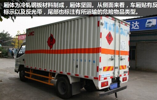 再來看看車廂,廂體為冷軋鋼板材料制成,廂體堅固。從側(cè)面來看,車廂貼有反光標(biāo)示以及反光帶,在夜晚運(yùn)輸時,有效提醒周圍車輛,同時也扯面和車尾部都標(biāo)注有所運(yùn)輸?shù)奈kU物品類型。