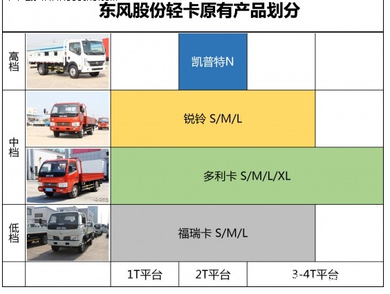 東風(fēng)股份在本次產(chǎn)品線調(diào)整以前是實(shí)行的橫向品系品牌戰(zhàn)略,高檔輕卡是凱普特,采用凱普斯達(dá)的車型技術(shù);中檔輕卡是銳玲(S/M)和多利卡(S/M/L/XL);低檔輕卡的是福瑞卡(S/M/L)。