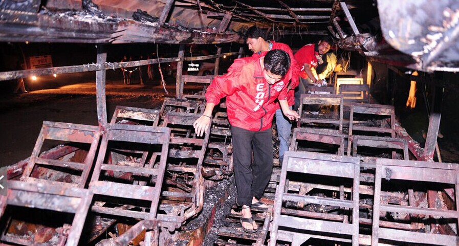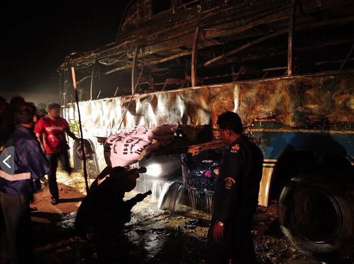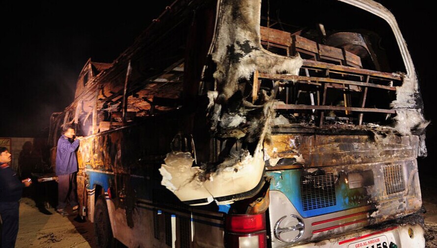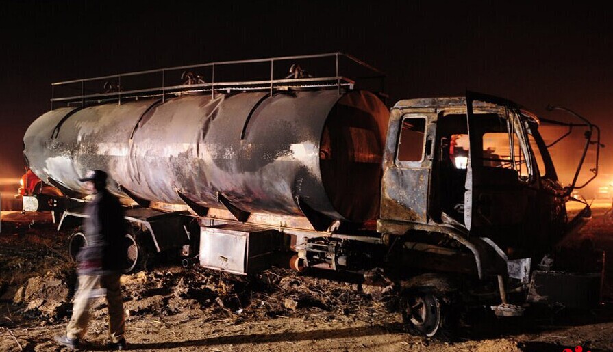 當?shù)貢r間2015年1月11日,巴基斯坦卡拉奇,當?shù)匾惠v大客車在高速公路上與一輛油罐車相撞,至少造成57人死亡,其中包括婦女與兒童。圖片來源:ASIF HASSAN/CFP