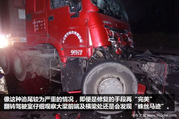 或者翻轉(zhuǎn)駕駛室,觀察發(fā)動(dòng)機(jī)前側(cè)的大梁及橫梁部分。如果是追尾較嚴(yán)重的車,大梁前端及駕駛室的損傷會(huì)較為嚴(yán)重,即便是修復(fù)再為“完美”,仔細(xì)觀察此處,總會(huì)發(fā)現(xiàn)蛛絲馬跡的。成規(guī)模的二手車場(chǎng)人員會(huì)較雜,不乏有無良商家,他們的作假技術(shù)都比較專業(yè),挑選車輛一定要瞪大眼睛,不可忽視細(xì)節(jié)。