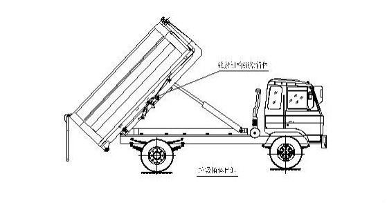 該車是由汽車底盤、拉臂主油缸、附車架、翻轉(zhuǎn)架、支撐腿(選裝)、鎖緊架、鎖緊油缸及多路換向閥等組成。翻轉(zhuǎn)架一端連在附車架上,其另一端設(shè)有活動拉臂,中間安裝有鎖緊系統(tǒng);活動臂油缸一端連在活動臂上,另一端連接在附車架上;鎖緊機構(gòu)通過鎖緊油缸的動作可以在箱體自卸時將附車架上的箱體與翻轉(zhuǎn)架及拉臂連為一體,在主油缸伸出時形成自卸角,也可以通過鎖緊油缸的收回把翻轉(zhuǎn)架與附車架鎖緊為一體,利用主油缸的收回或伸出使活動拉臂將地下的垃圾箱拖拉至附車架上或從附車架上放回到地面。