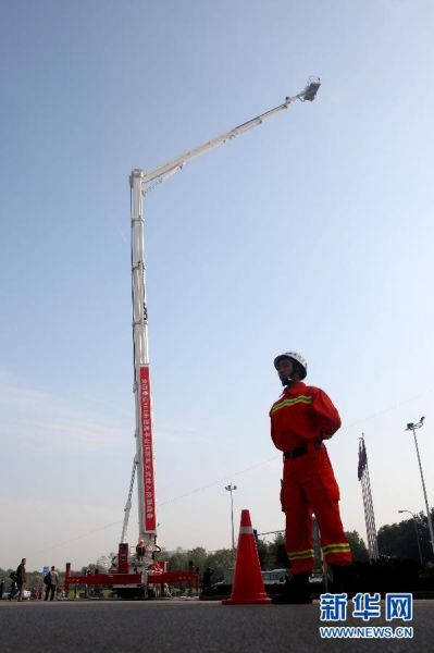 11月2日,101米消防登高車在武漢舉行的高層建筑滅火救援演練中亮相?! ‘斎?,湖北省公安消防部隊在武漢舉行高層建筑跨區(qū)域滅火救援演練,武漢消防的一輛101米消防登高車在演習(xí)中首次亮相。該登高車最大升限為101米,主要應(yīng)對69米至101米高層建筑火災(zāi)撲救,加上水泵的壓力后,最大噴射高度能達到150米左右,約50層樓高,可在高層建筑的滅火與搶險救援中發(fā)揮重要的作用。 新華社發(fā)