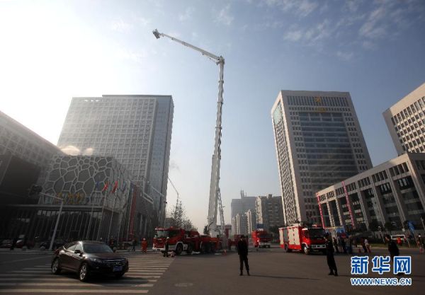 101米登高消防車亮相湖北武漢高層建筑滅火救援演練