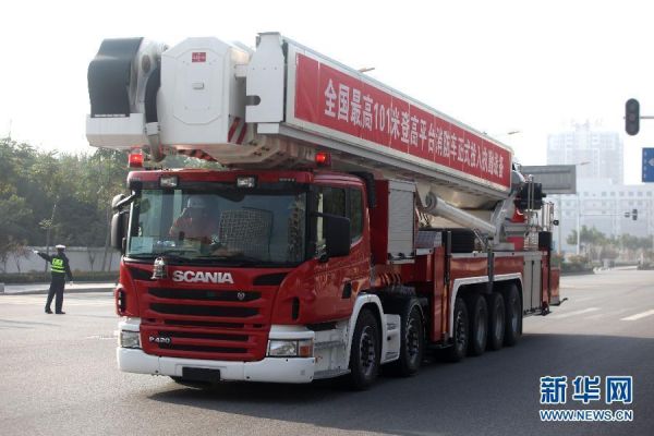 11月2日,101米消防登高車在武漢舉行的高層建筑滅火救援演練中亮相?! ‘斎?,湖北省公安消防部隊在武漢舉行高層建筑跨區(qū)域滅火救援演練,武漢消防的一輛101米消防登高車在演習(xí)中首次亮相。該登高車最大升限為101米,主要應(yīng)對69米至101米高層建筑火災(zāi)撲救,加上水泵的壓力后,最大噴射高度能達到150米左右,約50層樓高,可在高層建筑的滅火與搶險救援中發(fā)揮重要的作用?! ⌒氯A社發(fā)(惠斌 攝)