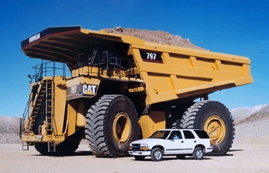 上圖是礦用翻斗車。和正常的城市旅行車對比就知道尺寸了。CAT卡特是是世界知名的工程機械廠家。