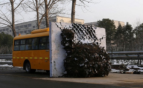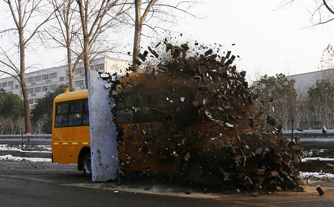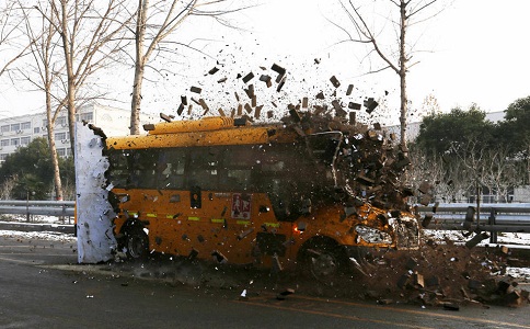 2015年11月27日,鄭州舉辦校車安全質(zhì)量檢測。起步、加速、飛馳、撞!“嘭”的一聲巨響之后,磚土橫飛,校車從中穿越而出。