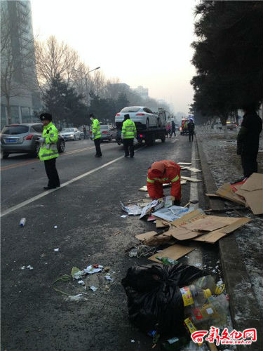 新文化記者趕到現(xiàn)場(chǎng)時(shí),肇事的轎車已被拖到拖車上,被撞的手推車也固定在了拖車上。距離拖車不遠(yuǎn)的路面上,散落著大量紙殼、木板等物,一名環(huán)衛(wèi)工人正在收拾,幾名交警在維持附近的交通。