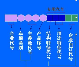 完整的汽車代碼(也就是我們常說的整車型號),由兩位企業(yè)代號,一位車輛類別,兩位主參數(shù)代號,一位產(chǎn)品序號,一位結(jié)構(gòu)特征代號,兩位用途特征代號(例如灑水車就是SS,運油車就是YY),兩位企業(yè)自訂代號組成。如上圖。