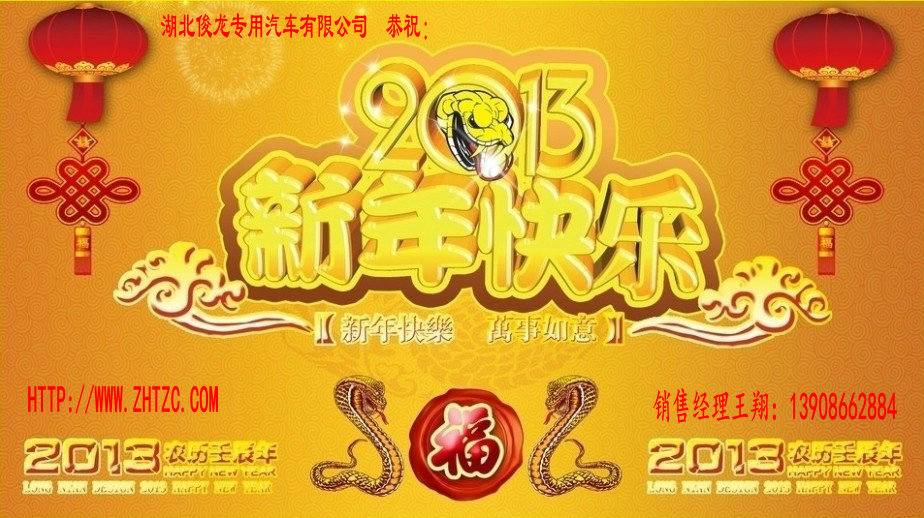 一年一度的春節(jié)到了,新的2013年是蛇年,銀蛇狂舞辭舊歲,湖北俊龍專用汽車有限公司 銷售經(jīng)理王翔在此向廣大用戶說(shuō)一聲 新年好!希望大家在新的一年里,事事順心,生意興隆,財(cái)源廣進(jìn)!