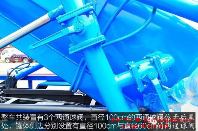 整車共裝置有3個(gè)兩通球閥,直徑100cm的兩通球閥位于后蓋處,罐體側(cè)邊分別設(shè)置有直徑100cm與直徑60cm的兩通球閥,藍(lán)漆封釉,與罐體顏色融為一體。