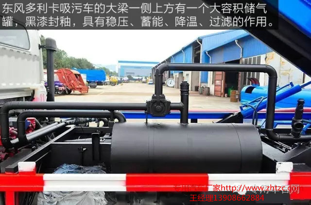 東風(fēng)多利卡吸污車的大梁一側(cè)上方有一個(gè)大容積儲(chǔ)氣罐,黑漆封釉,具有穩(wěn)壓、蓄能、降溫、過(guò)濾的作用。