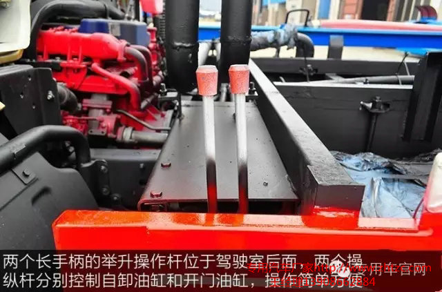 兩個(gè)長(zhǎng)手柄的舉升操作桿位于駕駛室后面,兩個(gè)操縱桿分別控制自卸油缸和開(kāi)門油缸,操作簡(jiǎn)單方便。