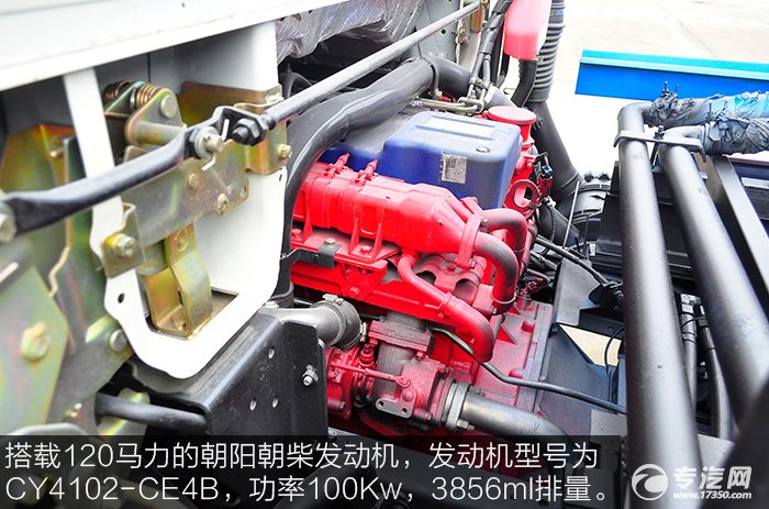 搭載120馬力的朝陽(yáng)朝柴發(fā)動(dòng)機(jī),發(fā)動(dòng)機(jī)型號(hào)為CY4102-CE4B,功率100Kw,3856ml排量。發(fā)動(dòng)機(jī)位于駕駛室后面,醒目易辨識(shí)。