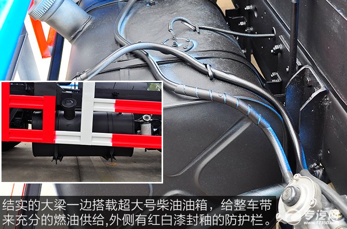 結(jié)實(shí)的大梁一邊搭載超大號(hào)柴油油箱,給整車(chē)帶來(lái)充分的燃油供給,外側(cè)有紅白漆封釉的防護(hù)欄,在保護(hù)油箱防撞的同時(shí)又保持整車(chē)的美觀。