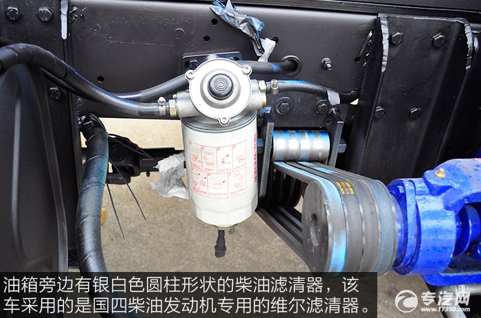 油箱旁邊有銀白色圓柱形狀的柴油濾清器,該車(chē)采用的是國(guó)四柴油發(fā)動(dòng)機(jī)專(zhuān)用的維爾濾清器,有效延長(zhǎng)發(fā)動(dòng)機(jī)使用壽命,降低維修費(fèi)用,節(jié)約燃油。