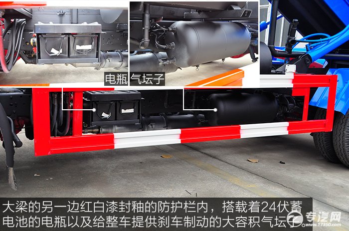 大梁的另一邊紅白漆封釉的防護(hù)欄內(nèi),搭載著24伏蓄電池的電瓶以及給整車(chē)提供剎車(chē)制動(dòng)的大容積氣壇子。該車(chē)使用的是氣剎制動(dòng),結(jié)構(gòu)復(fù)雜,具有剎車(chē)距離短,反應(yīng)快的優(yōu)勢(shì)。維修費(fèi)用相比油剎要高,但行車(chē)制動(dòng)安全高效。