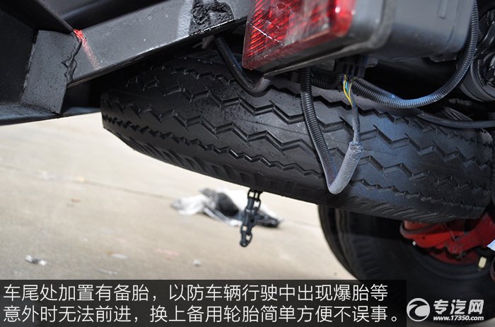 車(chē)尾處加置有備胎,以防車(chē)輛行駛中出現(xiàn)爆胎等意外時(shí)無(wú)法前進(jìn),換上備用輪胎簡(jiǎn)單方便不誤事。