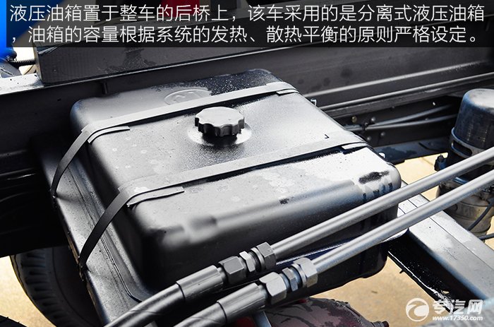 液壓油箱置于整車(chē)的后橋上,該車(chē)采用的是分離式液壓油箱,油箱的容量根據(jù)系統(tǒng)的發(fā)熱、散熱平衡的原則嚴(yán)格設(shè)定。