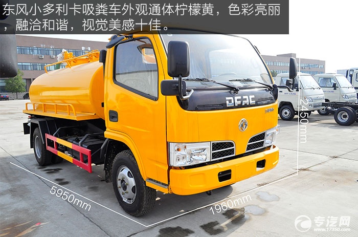東風小多利卡吸糞車外觀通體檸檬黃,色彩亮麗,融洽和諧,視覺美感十佳。整車的尺寸為5950×1960×2450mm。