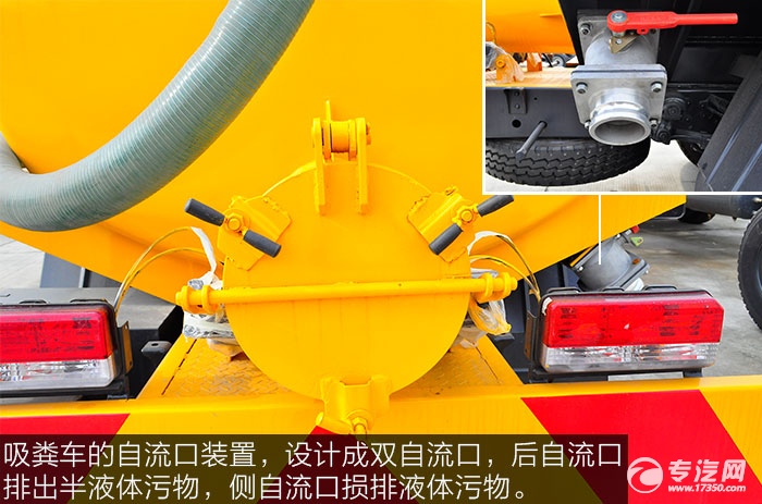 吸糞車的自流口裝置,設(shè)計(jì)成雙自流口,后自流口排出半液體污物,側(cè)自流口損排液體污物,使排污方式更加靈活起來。