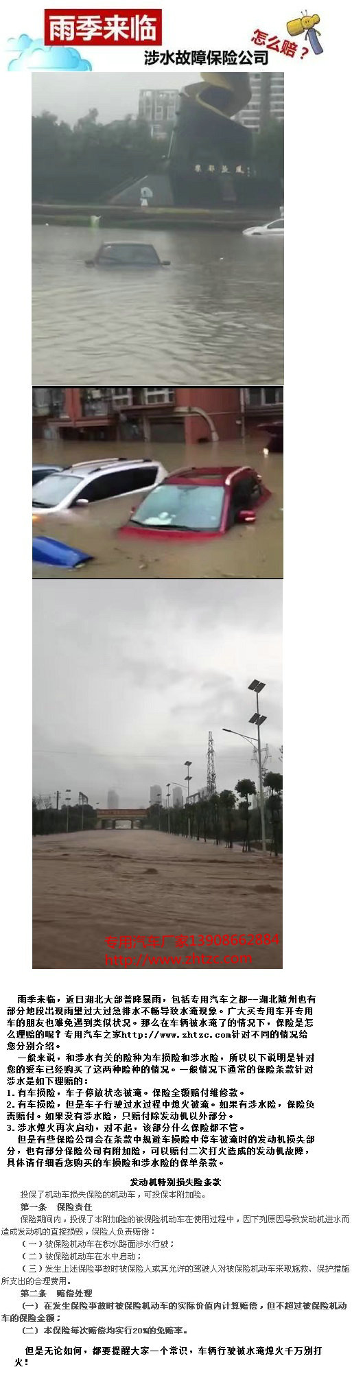 雨季來臨,近日湖北大部普降暴雨,包括專用汽車之都--湖北隨州也有部分地段出現(xiàn)雨量過大過急排水不暢導(dǎo)致水淹現(xiàn)象。廣大買專用車開專用車的朋友也難免遇到類似狀況。那么在車輛被水淹了的情況下,保險是怎么理賠的呢?專用汽車之家http://www.dentistssantacruz.com針對不同的情況給您分別介紹。