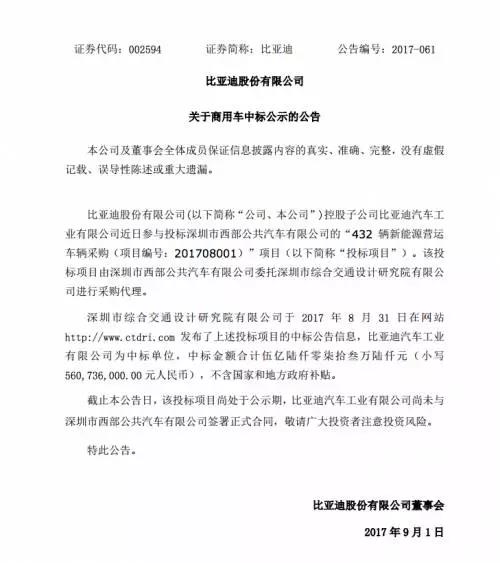 9月1日比亞迪發(fā)出公告稱,控股子公司比亞迪汽車工業(yè)有限公司中標(biāo)深圳市西部公共汽車有限公司的“432輛新能源營(yíng)運(yùn)車輛采購(gòu)”項(xiàng)目,中標(biāo)金額合計(jì)5.61億元,不含國(guó)家和地方政府補(bǔ)貼。