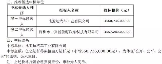 公告顯示,深圳市綜合交通設(shè)計(jì)研究院有限公司于2017年8月31日在網(wǎng)站發(fā)布了上述投標(biāo)項(xiàng)目的中標(biāo)公告信息,比亞迪汽車工業(yè)有限公司為中標(biāo)單位,中標(biāo)金額合計(jì)約人民幣5.61億元,不含國(guó)家和地方政府補(bǔ)貼。