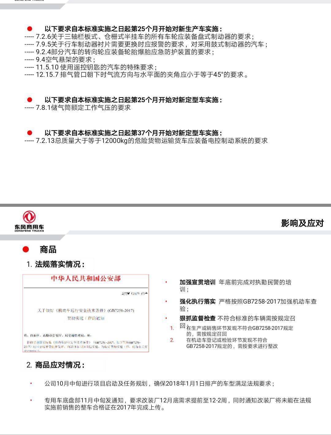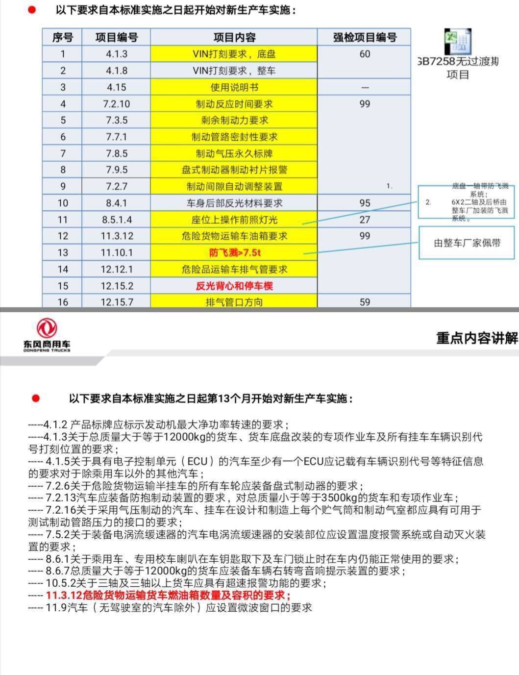 由于新GB7258-2017在2018.1.1起開始實施,法規(guī)要求所有車型需增加VIN打刻要求、防飛濺系統(tǒng)、剎車自動調(diào)整臂、前照燈高度調(diào)整裝置、儲氣筒氣壓標(biāo)牌、制動襯片更換報警裝置(危險品車輛)、反光背心和停車楔等,倉柵車要求蓬桿焊死!