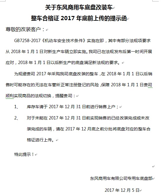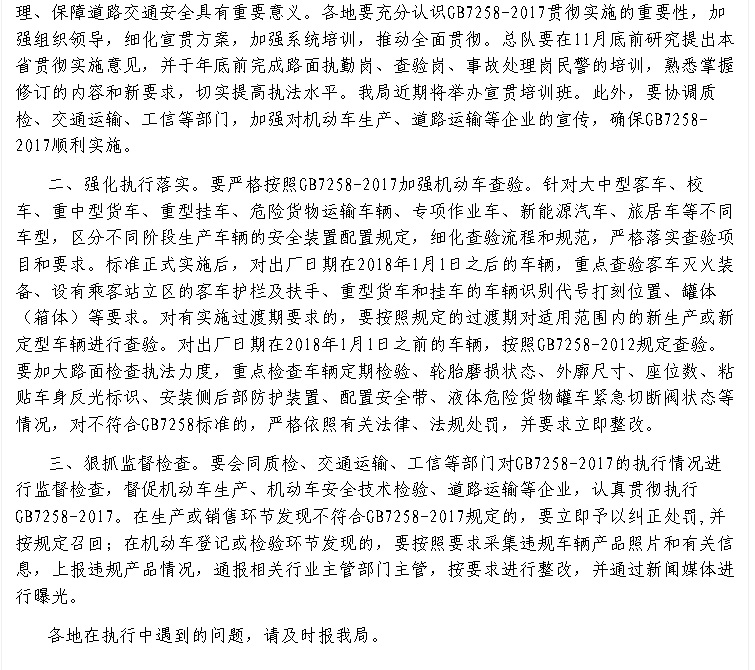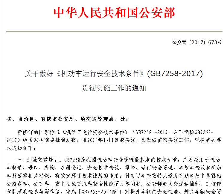 新的國標GB7258-2017<機動車安全技術(shù)條件>即將逐步全面實施,請大家注意2018.1.1這個時間點。不滿足GB7258新標準的產(chǎn)品,應在2018.1.1前上傳合格證,已購車用戶請盡快上牌完畢。不滿足油耗三階段只滿足二階段的應在2018.1.1前完成營運證的辦理。
