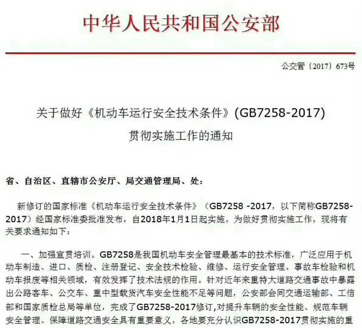 新的GB7258-2017《機動車運行安全技術(shù)條件》法規(guī)要求所有車型需增加VIN打刻要求、防飛濺系統(tǒng)、剎車自動調(diào)整臂、前照燈高度調(diào)整裝置、儲氣筒氣壓標(biāo)牌、制動襯片更換報警裝置(危險品車輛)、反光背心和停車楔等,倉柵車要求蓬桿焊死。。。。